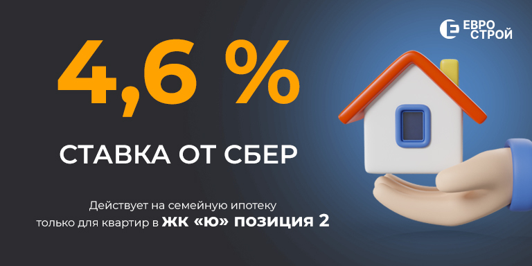 4,6% СТАВКА ОТ СБЕР Выгодная семейная ипотека действует только для квартир в ЖК «Ю», позиция 2. Покупай с минимальной ставкой и начни новую жизнь в современном районе!
